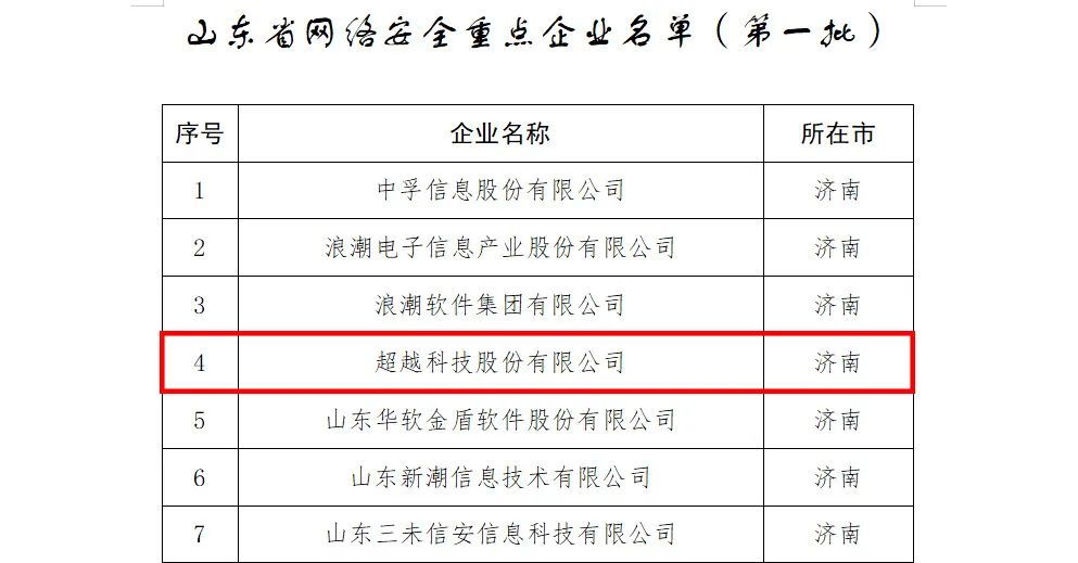 8月15日,山東省工業和信息化廳公布了《關于山東省網絡安全重點企業(機構)名單(第一批)》,超越科技憑借多年在網絡安全方面的深耕細作,成功登榜。