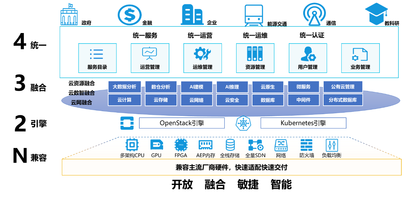 開放以開源為核心,源于開源,優于開源,打造產品差異化競爭力,堅持開放、分層解耦,踐行平臺+生態理念,構建開源開放的企業級私有云平臺。